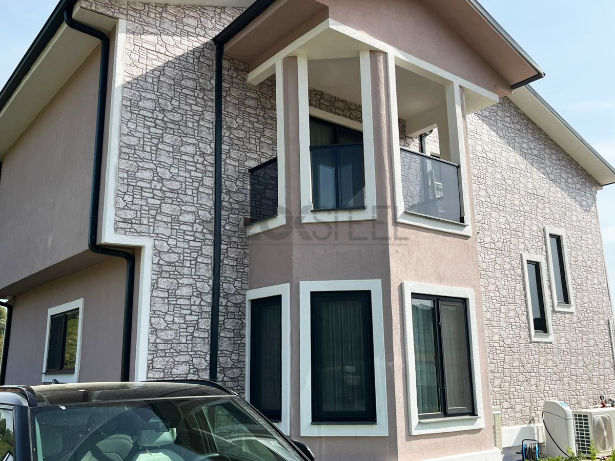 Unser Projekt Villa Cumbas , in dem Leichtstahlbautechnologie auf Ästhetik trifft, ist ein modernes Bauwerk mit einer großzügigen Wohnfläche von 199 m². Das Projekt, das seinen Namen von der modernen geometrischen Interpretation des traditionellen türkischen Architekturelements „Cumba“ erhält, fällt durch seine steinverkleidete Fassade auf, die sich harmonisch in die einzigartige Natur von Izmir einfügt.