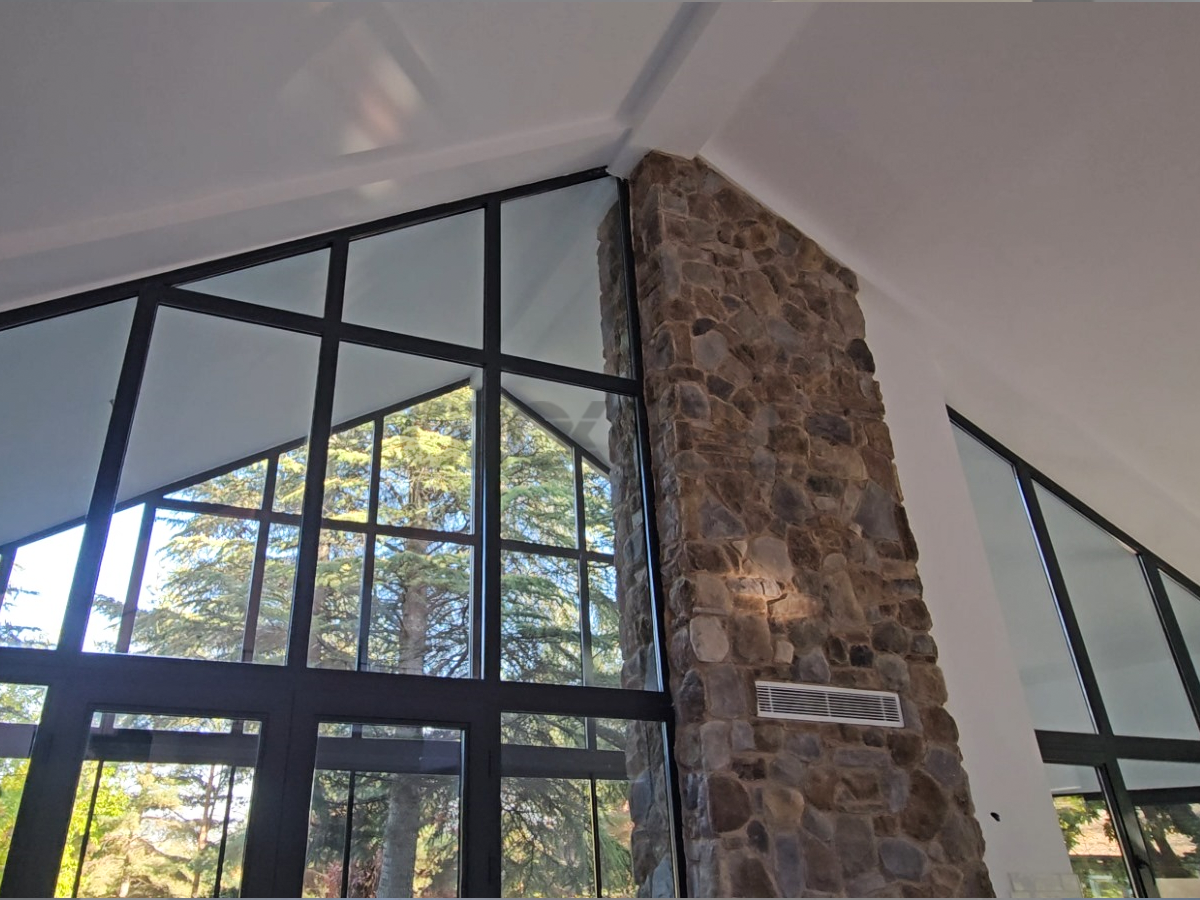 Architectural details featuring glass, wood, and stone textures give the structure a sense of refined aesthetic unity.