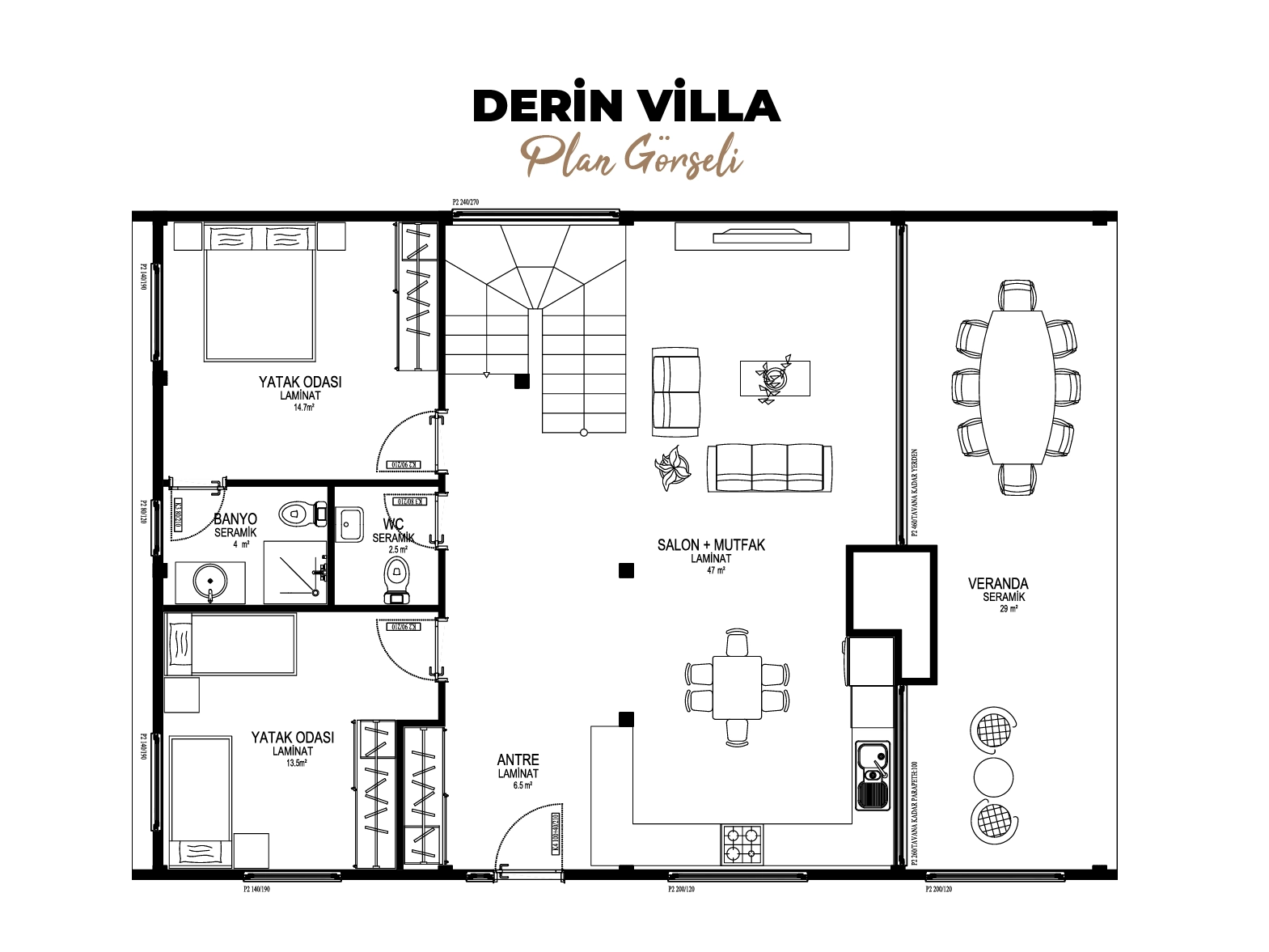 Derin Villa stands out with its modern architectural lines and spacious living areas, built with loft-style light steel structure technology.